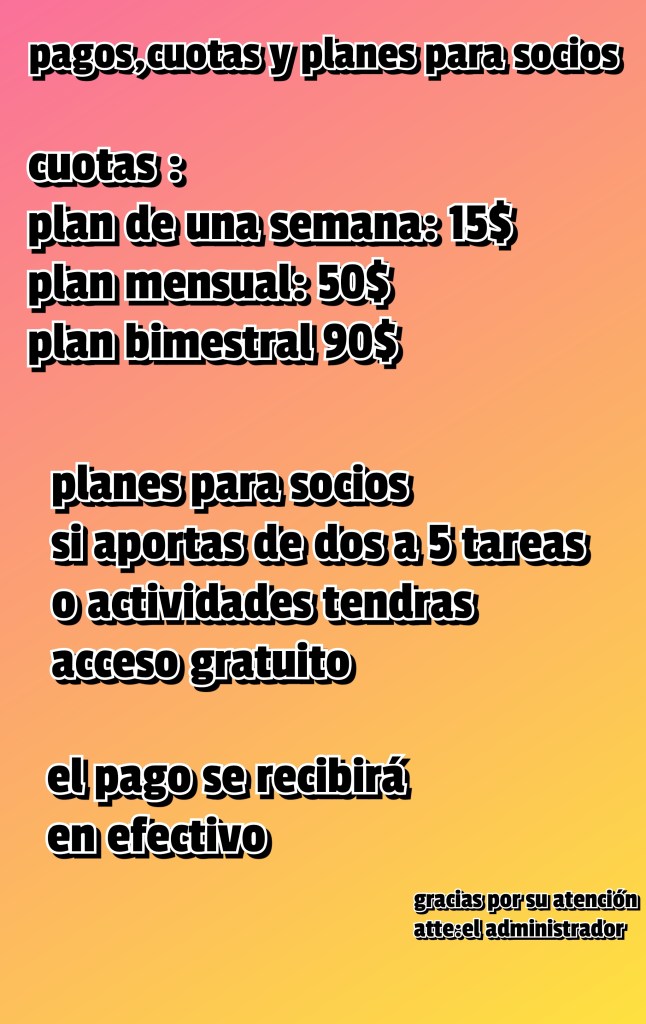 Cuotas y cobros por uso de la página : la página también tiene que poder sostenerse haci que para que la página sea rentable el primer me es gratuito para todos como mes de prueba y de hay en adelante se puede pagar por semana o mensual